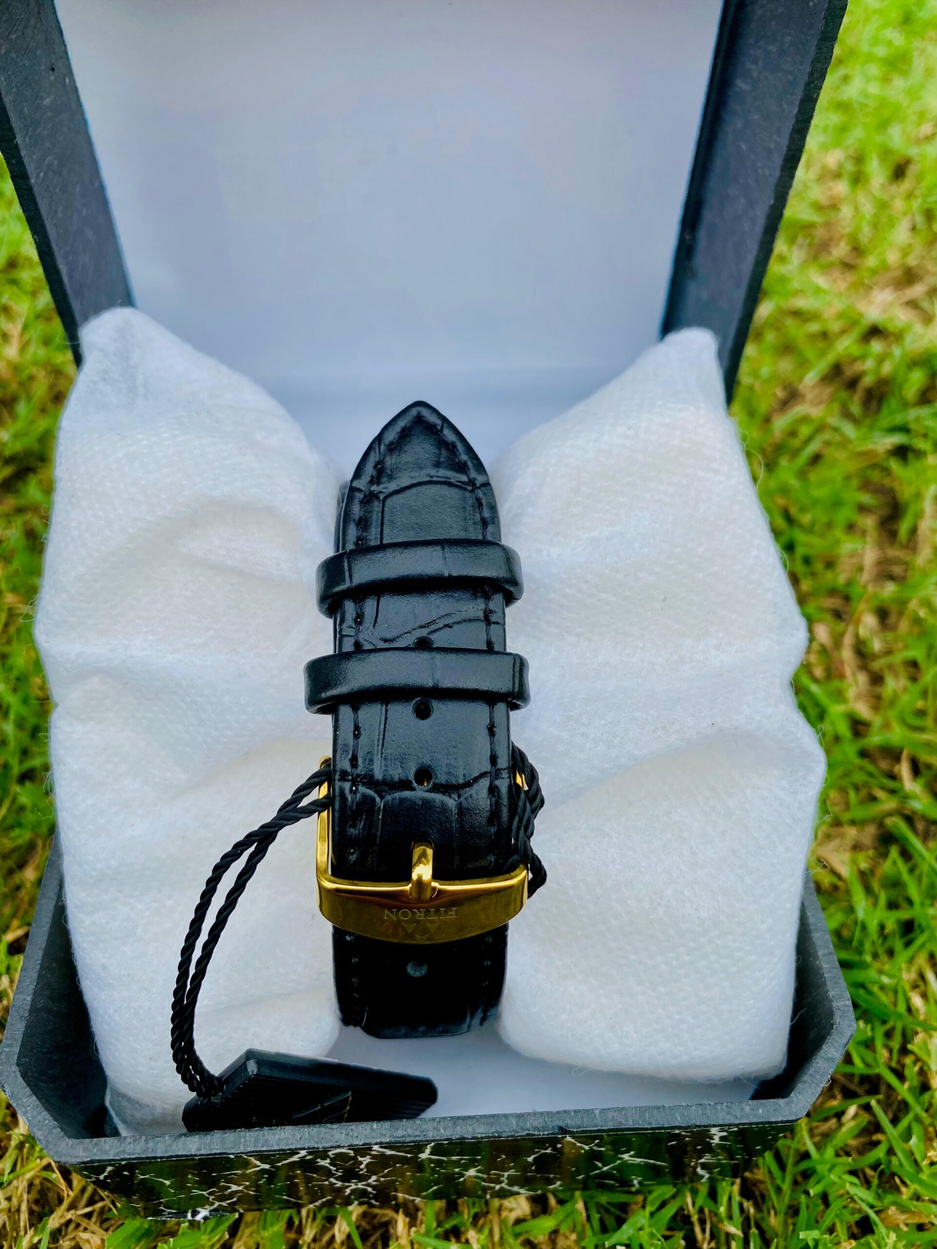 Genuine Leather Strap – Soft, black leather strap with a secure buckle for all-day comfort.